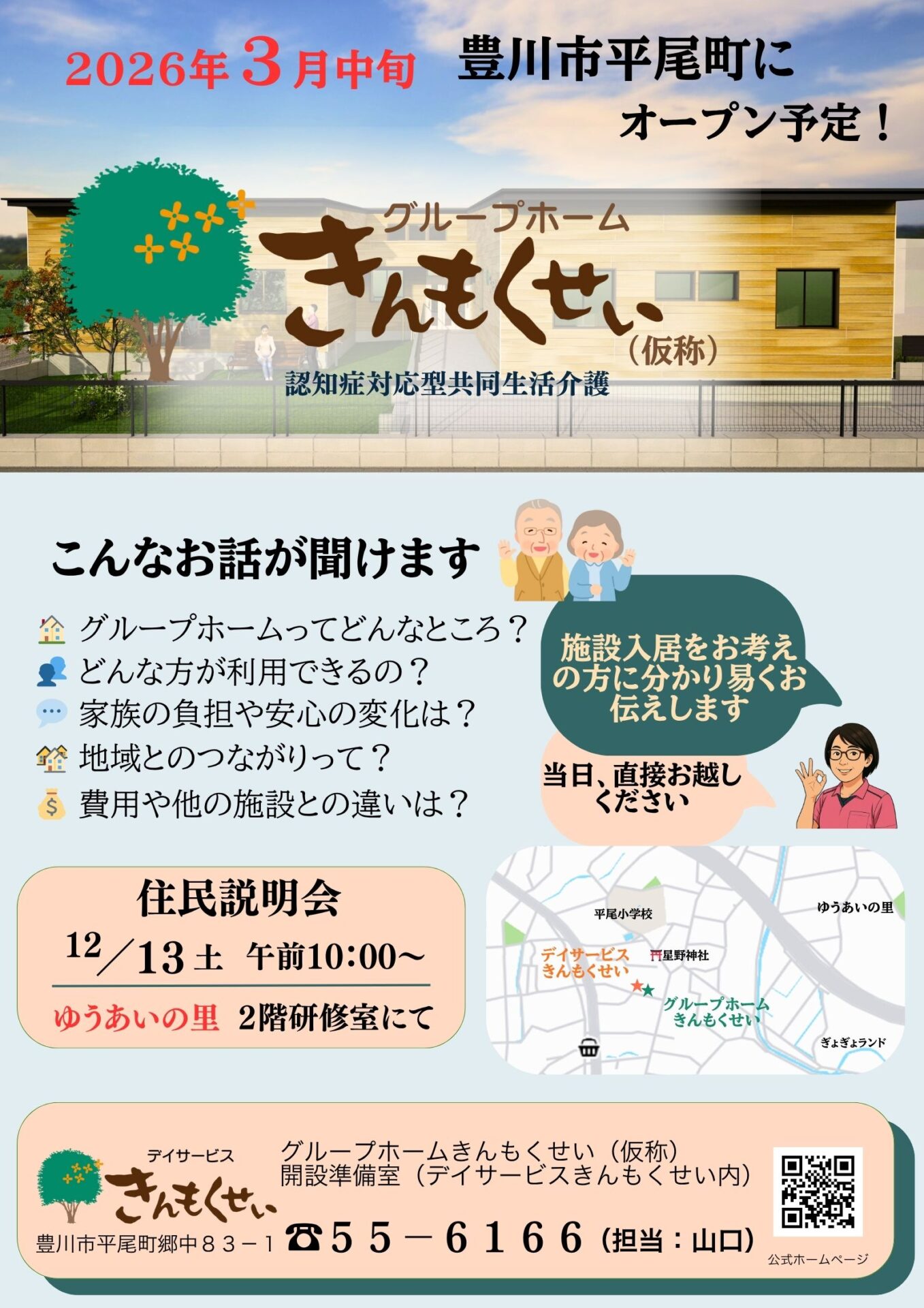 この度、きんもくせいはグループホームについて住民説明会を開催いたします。12月13日(土) 10:00〜ゆうあいの里(2階研修室にて)